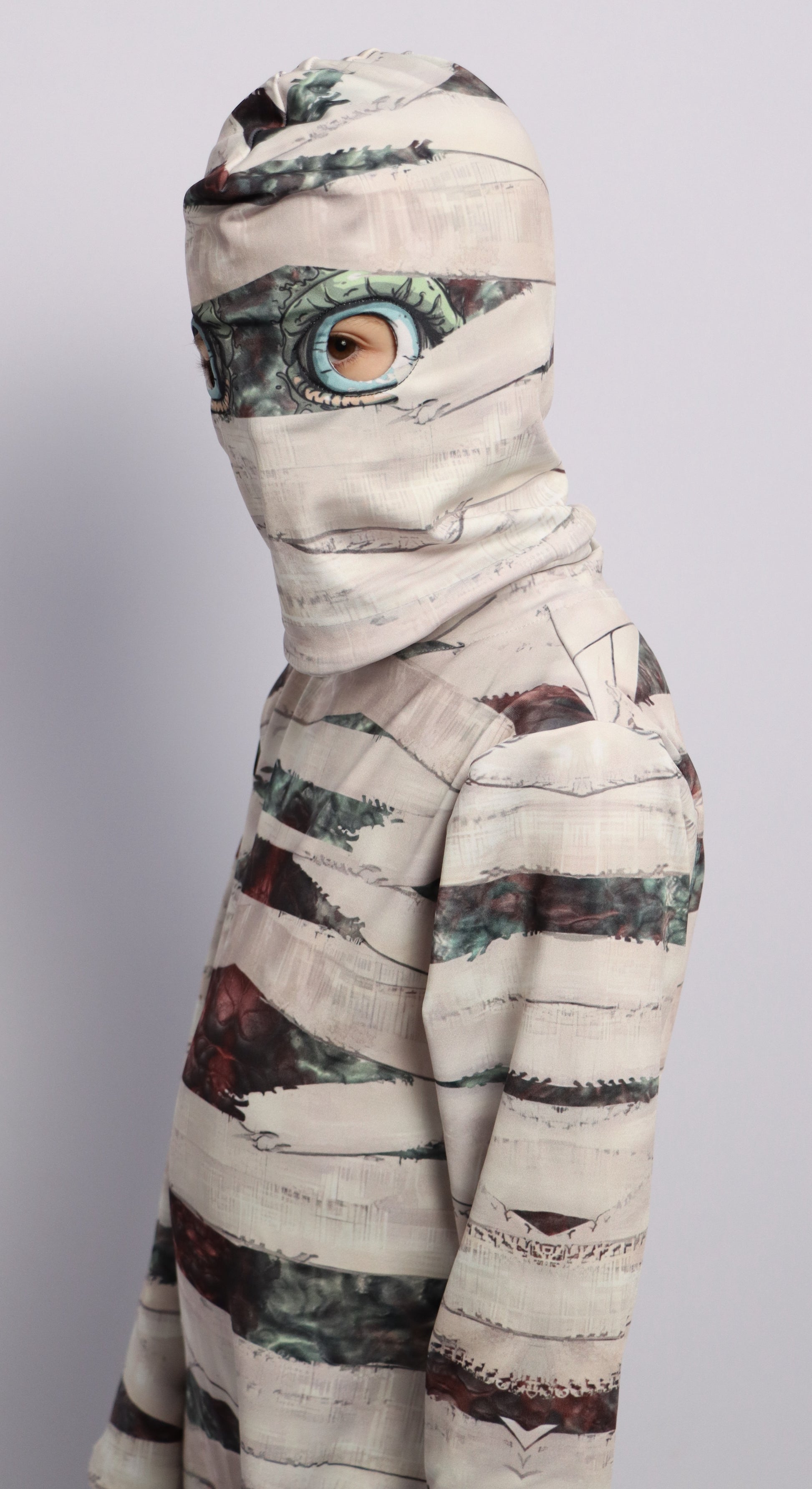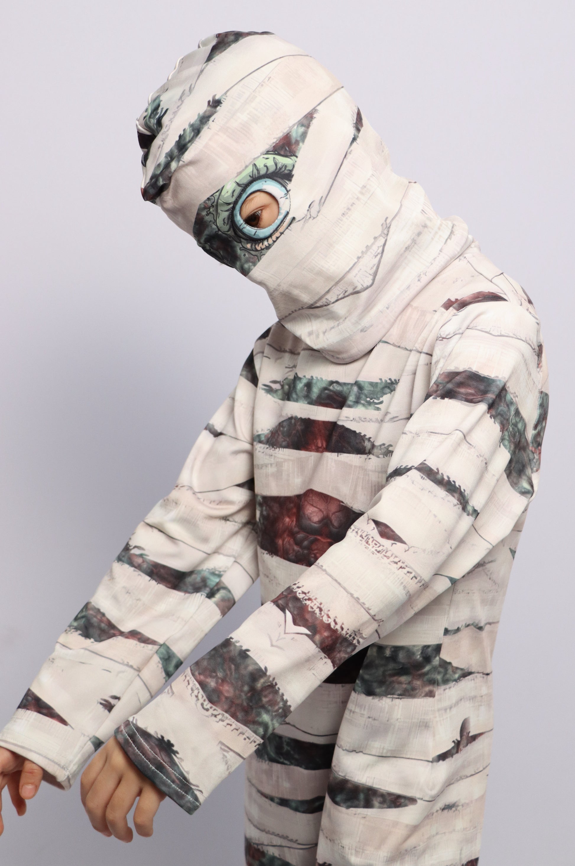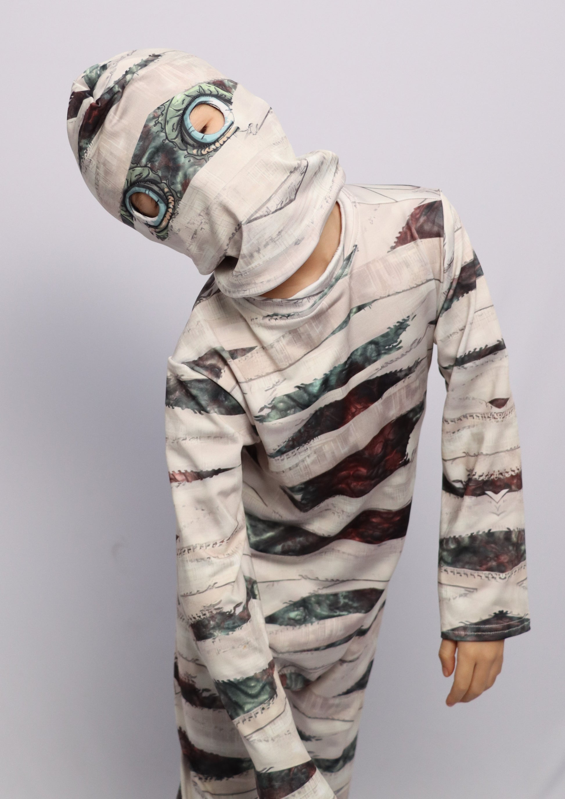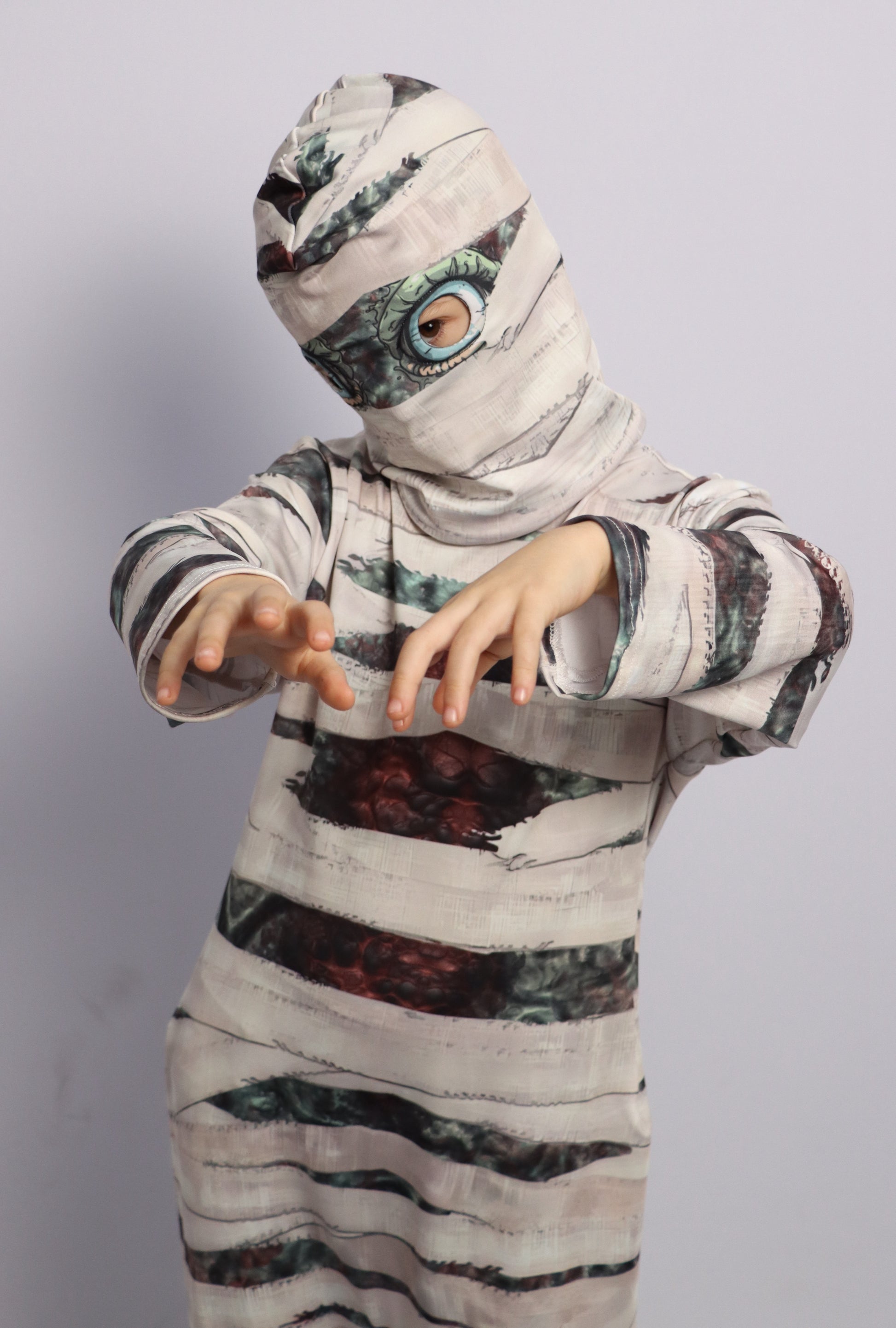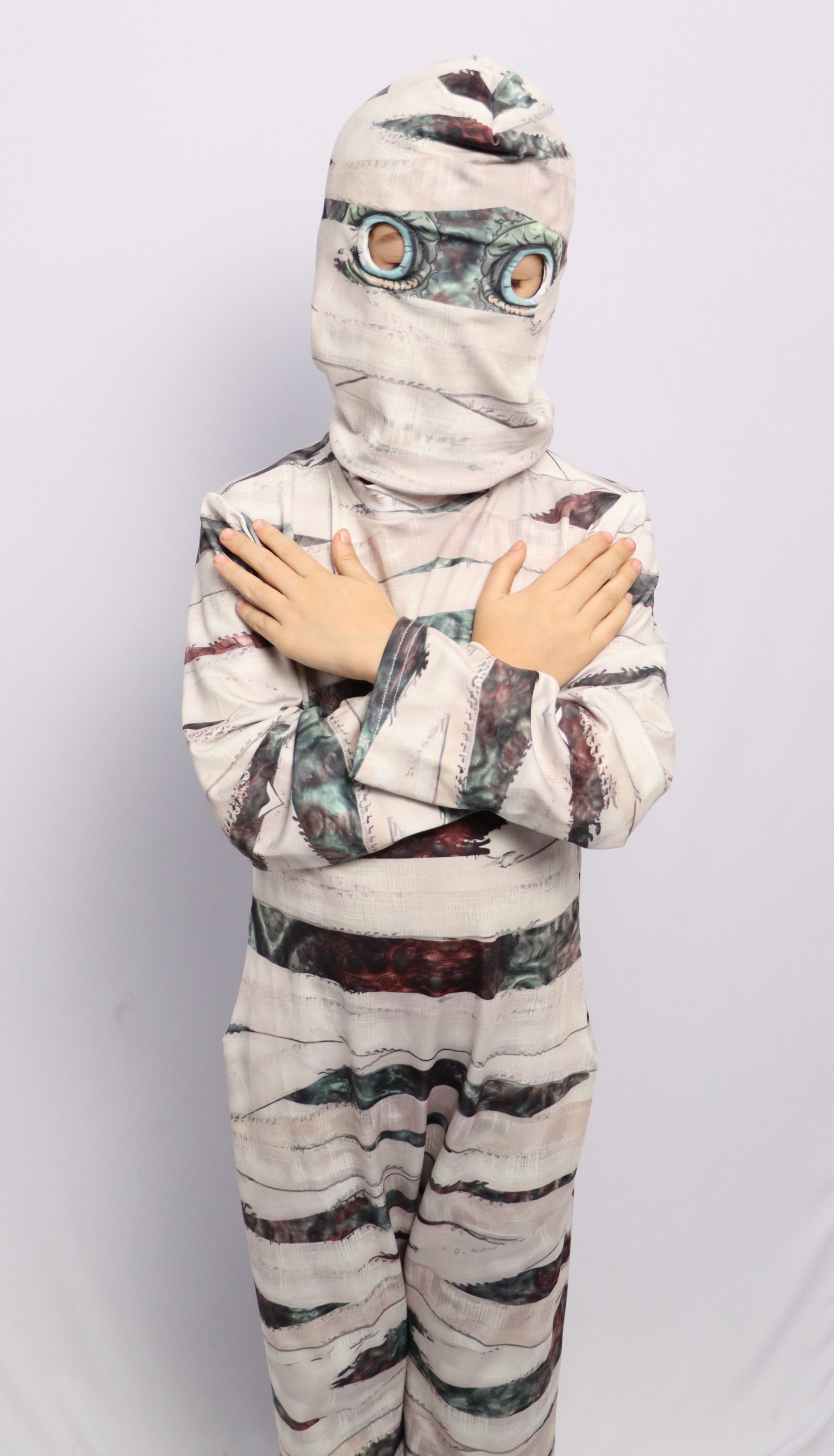 Conviértete en tu personaje favorito con este diseño de disfraz único inspirado en una Momia, hecho de tela elástica, cómoda y respirable. Perfecto para fiestas de Halloween, shows escolares o para vivir aventuras llenas de misterio y diversión.